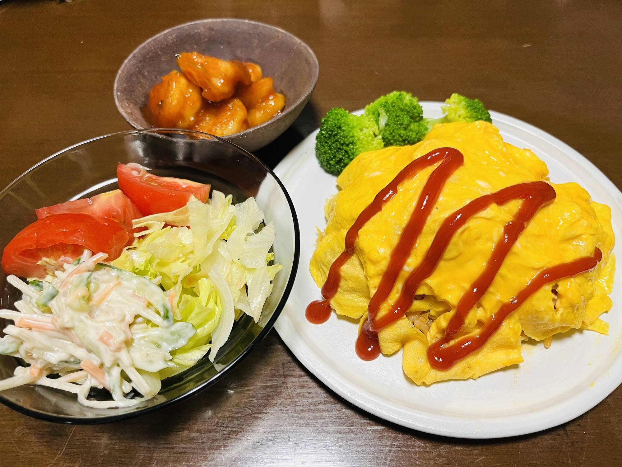 オムライス、茹でブロッコリー、エビチリ、ゴボウサラダ、トマト、レタス